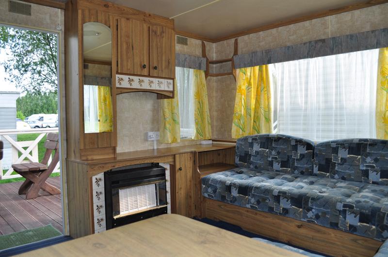 Pokój dzienny posiada 2 pojedyncze tapczany lub w drugiej opcji rozkładaną dwuosobową kanapę oraz 1 tapczan. W pokoju TV LCD, szafa, stolik kawowy. Domek nie posiada opcji gotowania, ale wyposażony jest w lodówkę, mikrofalówkę, czajnik elektryczny, talerzyki, szklanki i suszarkę do bielizny. Domek jest ogrzewany, posiada zadaszony i umeblowany taras.